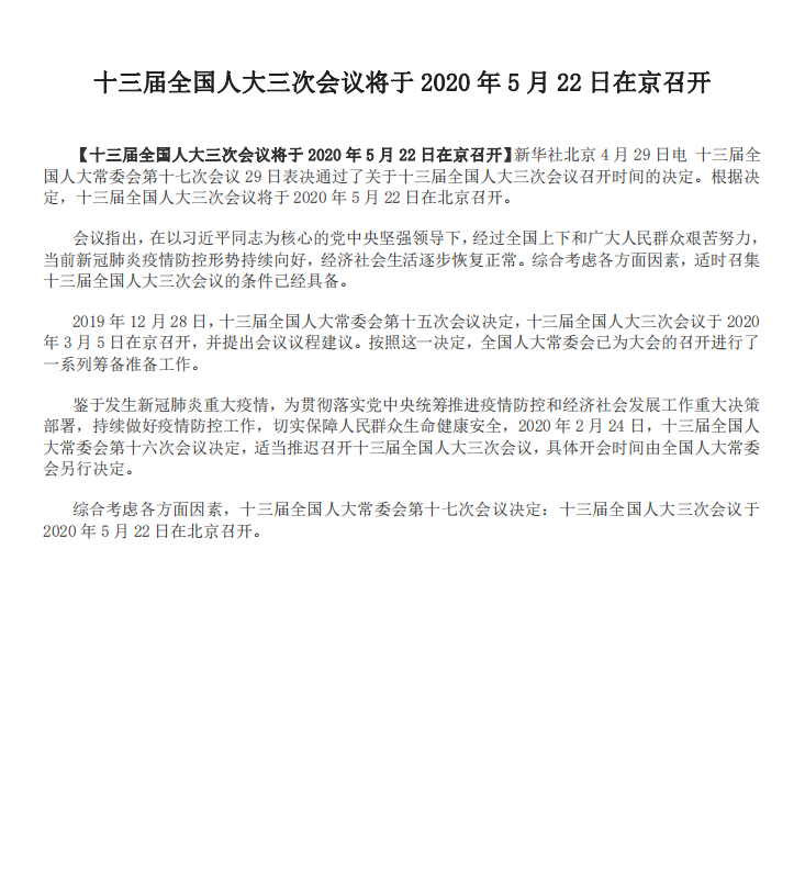 十三屆全國人大三次會議將于2020年5月22日在京召開